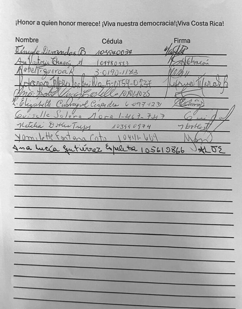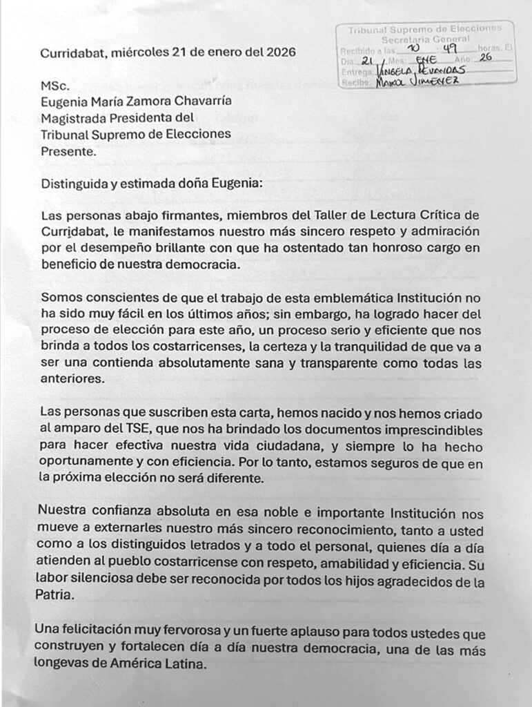 “Nos mueve a externarles nuestro más sincero reconocimiento, tanto a usted como a los distinguidos letrados y a todo el personal, quienes día a día atienden al pueblo costarricense con respeto, amabilidad y eficiencia, su labor silenciosa debe ser reconocida por todos los hijos agradecidos de la Patria”, señala la misiva.