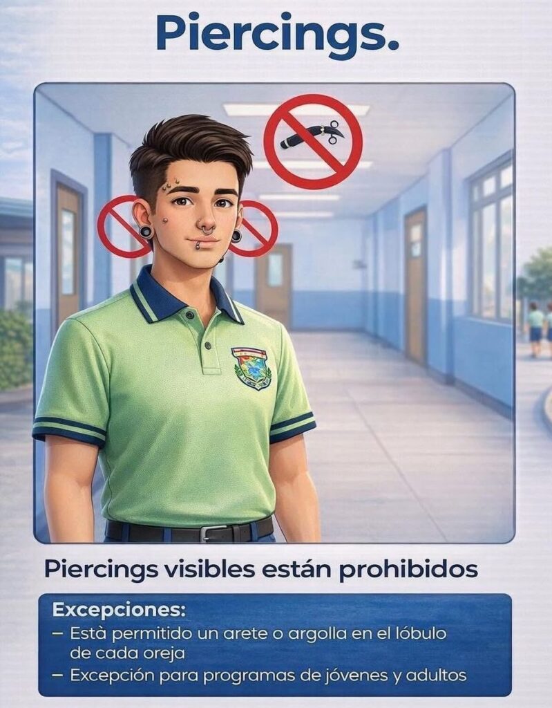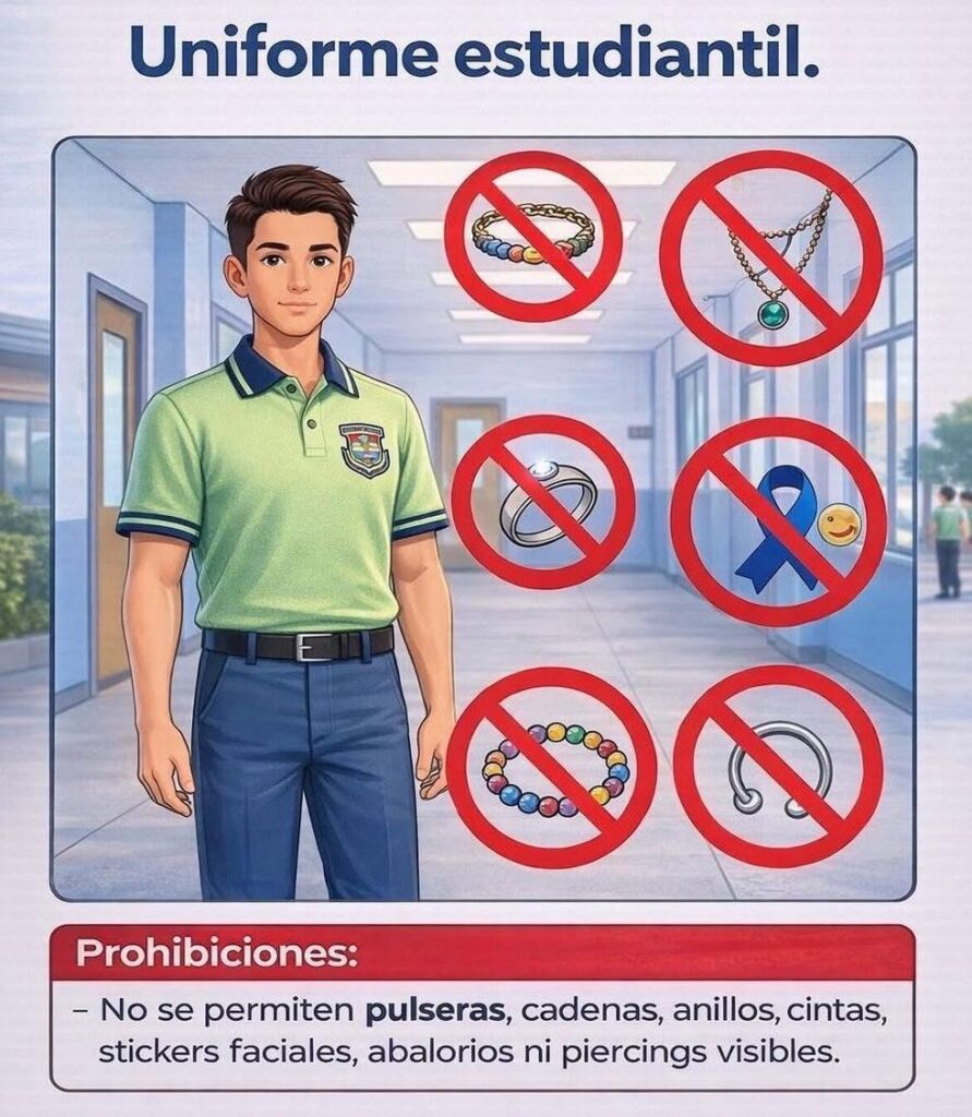 El MEP reafirma la importancia del uso adecuado del uniforme estudiantil, e indica que no se permite portar accesorios como pulseras, cadenas, anillos, cintas, stickers faciales, abalorios ni piercings visibles, con el objetivo de conservar la identidad institucional, evitar distracciones y promover la igualdad entre estudiantes.