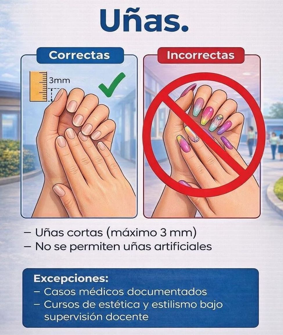 En relación con las uñas, el MEP establece que deberán mantenerse cortas, con un máximo permitido de tres milímetros, y se restringe el uso de uñas artificiales, con el fin de mantener estándares de higiene y seguridad dentro del entorno educativo.