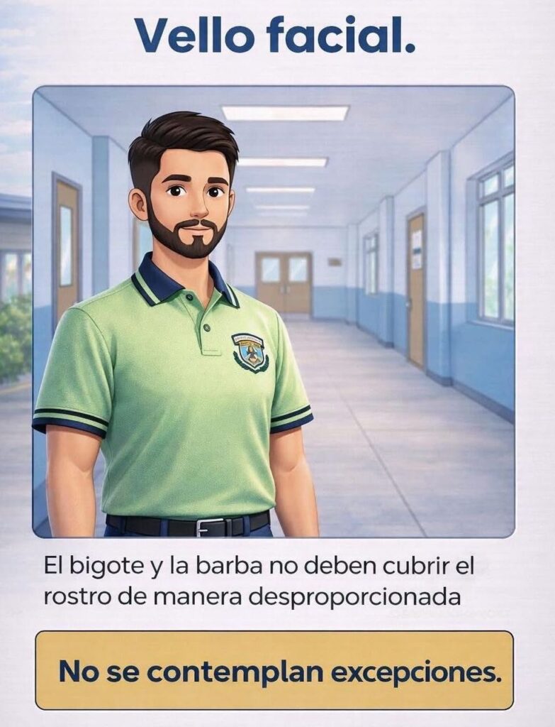 Asimismo, se dispone la prohibición de piercings visibles, permitiéndose únicamente un arete o argolla en el lóbulo de cada oreja. En cuanto al vello facial, se indica que este no deberá cubrir el rostro de forma desproporcionada, manteniendo una apariencia ordenada.