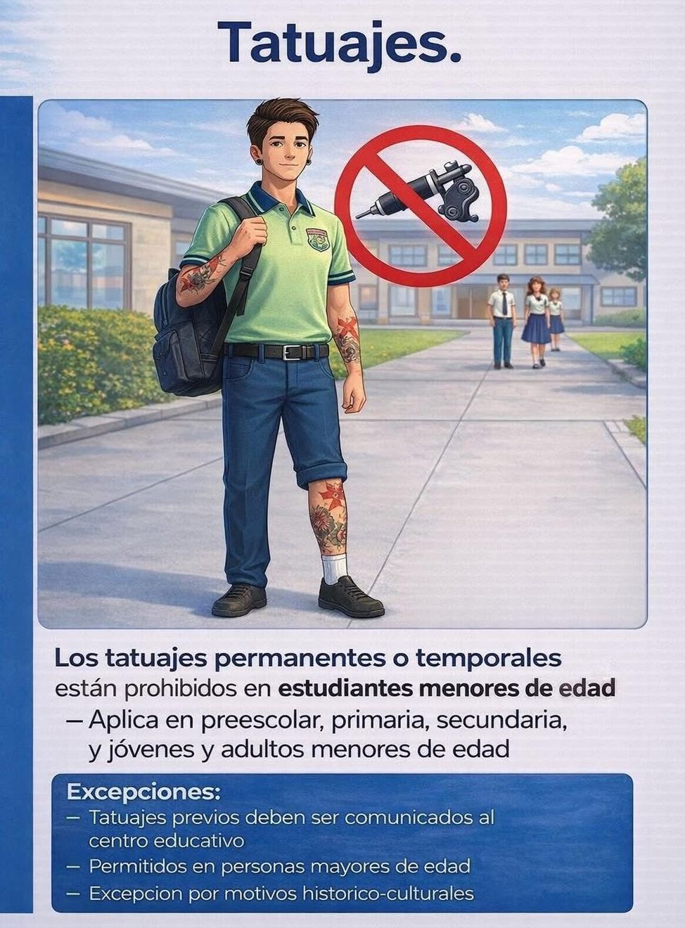 De acuerdo con la información divulgada, estas disposiciones establecen criterios específicos relacionados con el uso de maquillaje, el cuidado de las uñas, el uso de piercings, el vello facial, los tatuajes, el uso del uniforme, la tenencia y uso de teléfonos celulares, así como la prohibición del consumo de sustancias dentro de las instituciones educativas o en actividades oficiales.