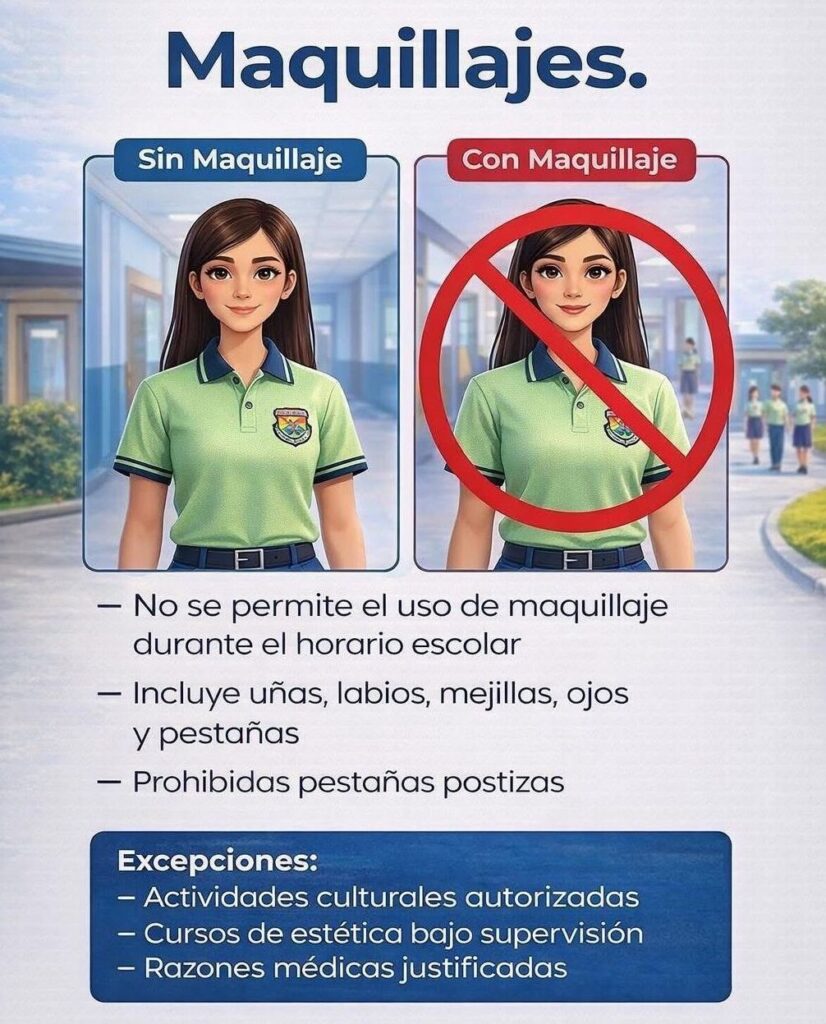 Entre las medidas señaladas, se indica que no se permite el uso de maquillaje durante el horario escolar, incluyendo elementos relacionados con uñas, labios, mejillas, ojos y pestañas, así como el uso de pestañas postizas. Se contemplan excepciones únicamente en casos específicos debidamente justificados, tales como actividades culturales autorizadas, cursos supervisados o razones médicas documentadas.