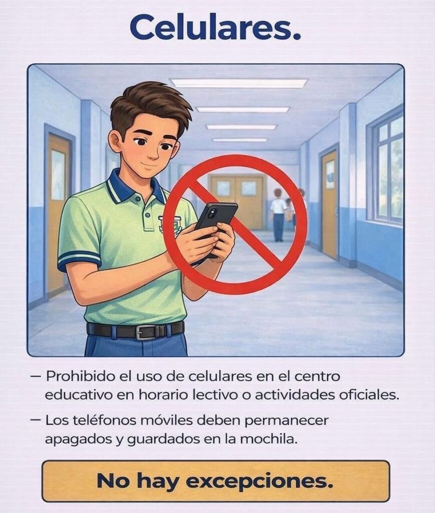 Respecto al uso de teléfonos móviles, se establece que el uso de celulares se encuentra prohibido en el centro educativo durante horario lectivo o en actividades oficiales, debiendo permanecer apagados y guardados en la mochila. En esta disposición se indica que no se contemplan excepciones.