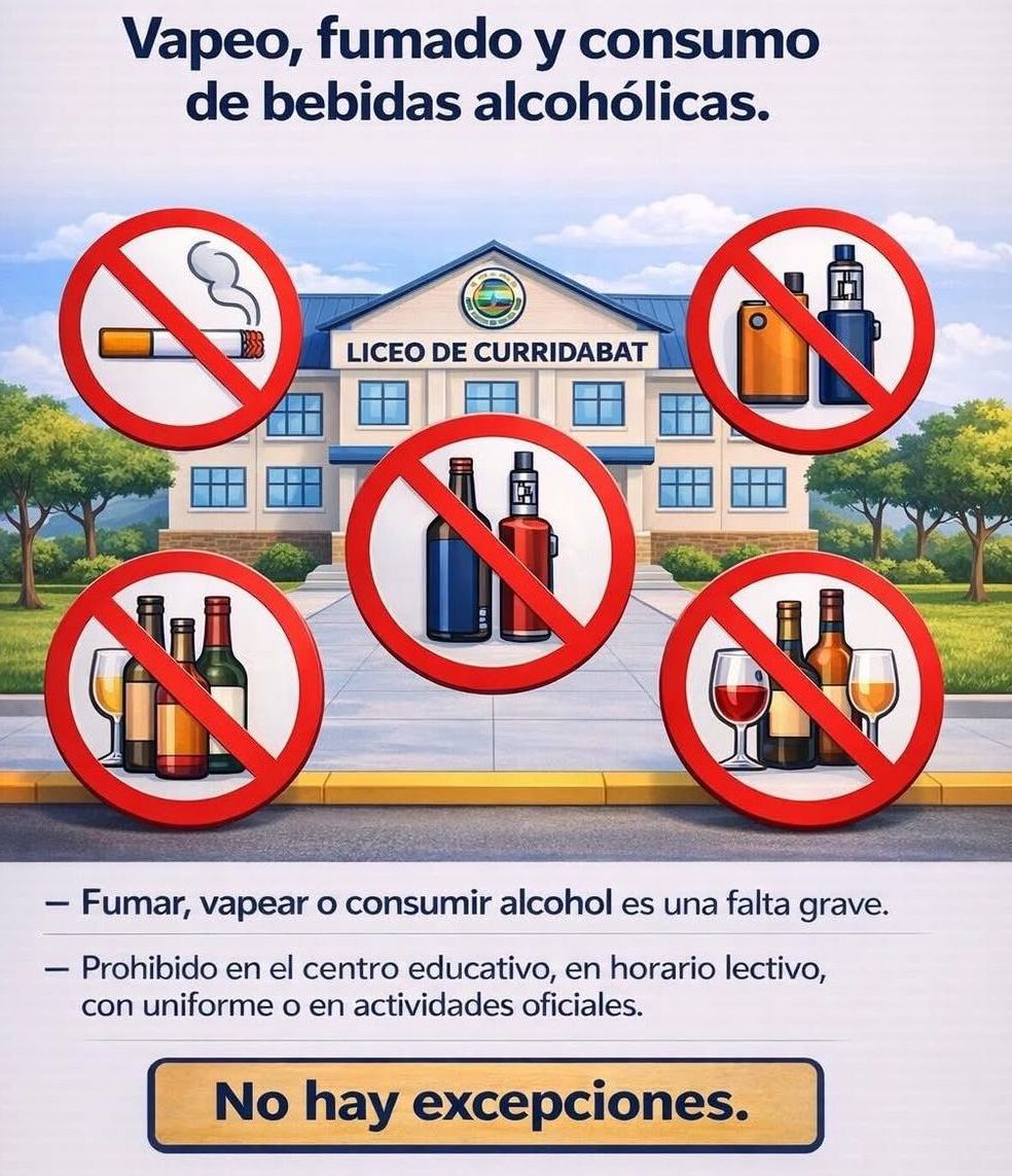 Finalmente, el MEP enfatiza que fumar, vapear o consumir bebidas alcohólicas constituye una falta grave, por lo cual se prohíbe su consumo dentro de la institución, en horario lectivo, con uniforme o durante actividades oficiales, sin excepciones.